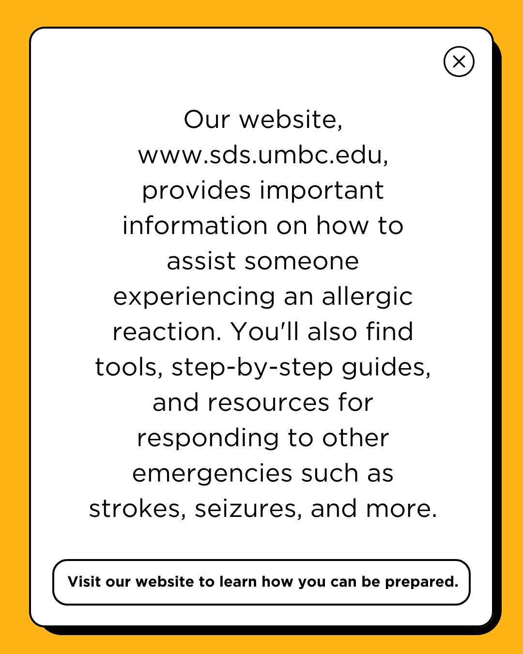 Visit sds.umbc.edu for tools, emergency response guides, and more information on how to assist someone experiencing an allergic reaction or other medical emergency.