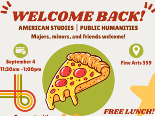 Welcome back, American Studies and Public Humanities students! We invite you to grab lunch and connect with professors and fellow students in American Studies! On September 4th, in Fine Arts...