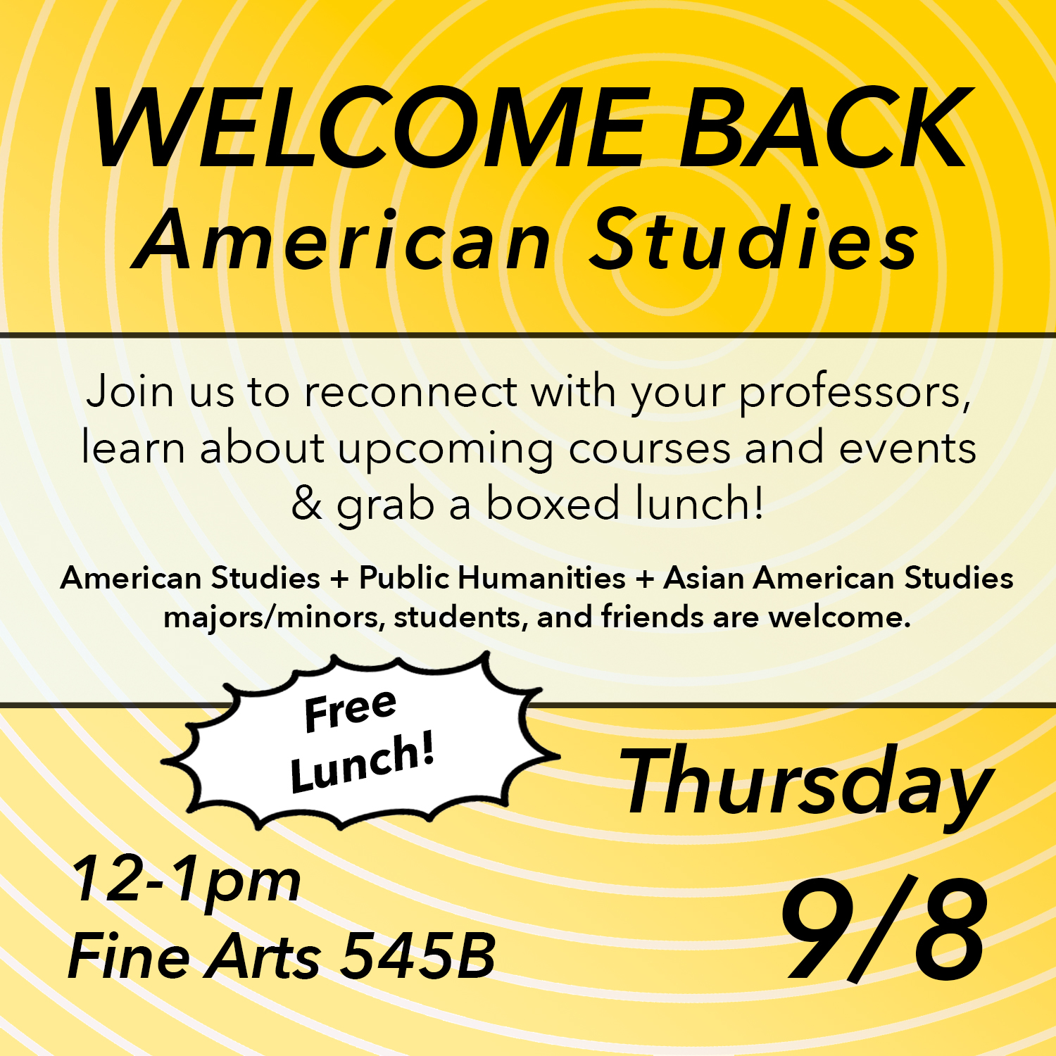 Please join us for a Welcome Week open house on Thursday, Sept. 8 from 12-1pm in Fine Arts 545-B (in the American Studies office suite) to kick off the fall 2022 semester! Come pick up a (free!) boxed lunch in Fine Arts 545-B.