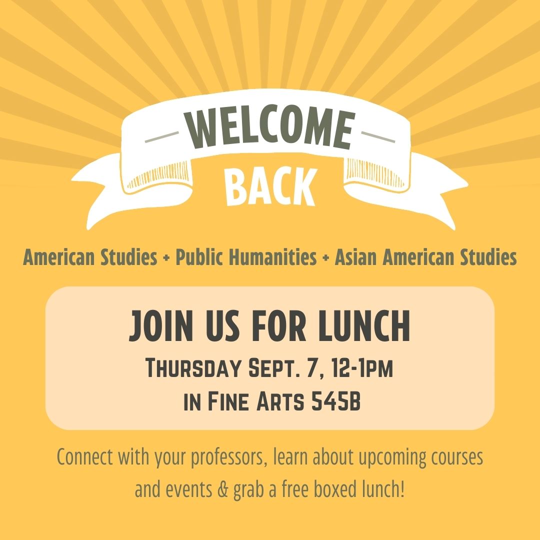 Please join us for a Welcome Week open house on Thursday, Sept. 7 from 12-1pm in Fine Arts 545-B (in the American Studies office suite) to kick off the fall 2023 semester!