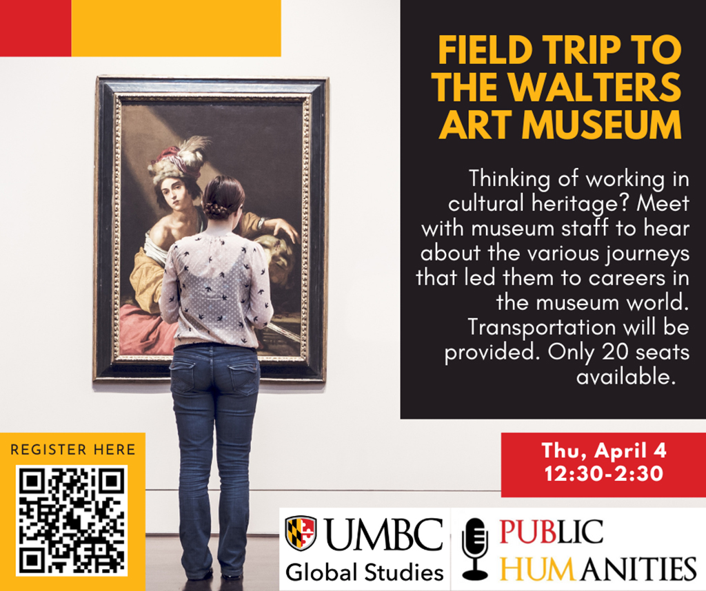 Join us on April 4, 2024 for a field trip to the Walters Art Museum to speak with curators and administrators in that field. Global Studies and Public Humanities are co-sponsoring the trip which will leave campus at 12:30 and return by 2:30 PM.