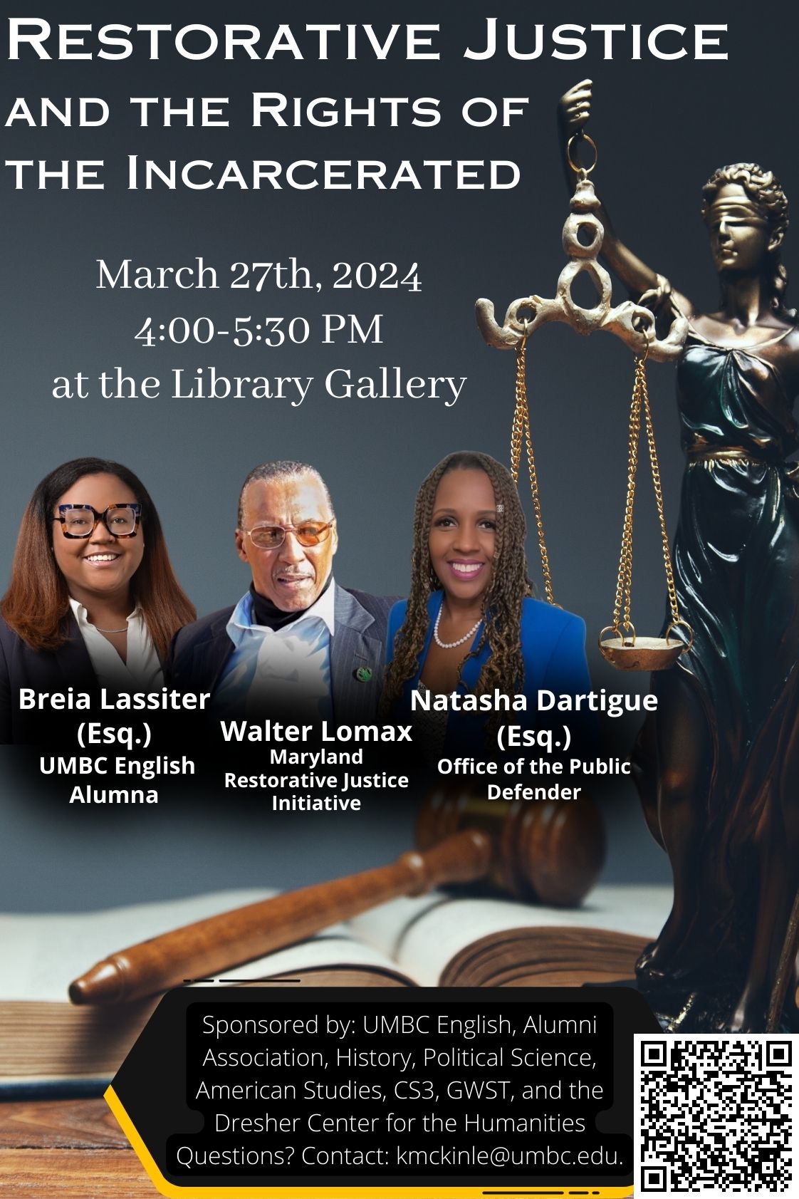 The English Department will host two events relating to law and restorative justice on March 27, 2024, inspired by the career path of 2018 UMBC English Alumna Breia Lassiter. She will return to UMBC to share her experiences with the university community.