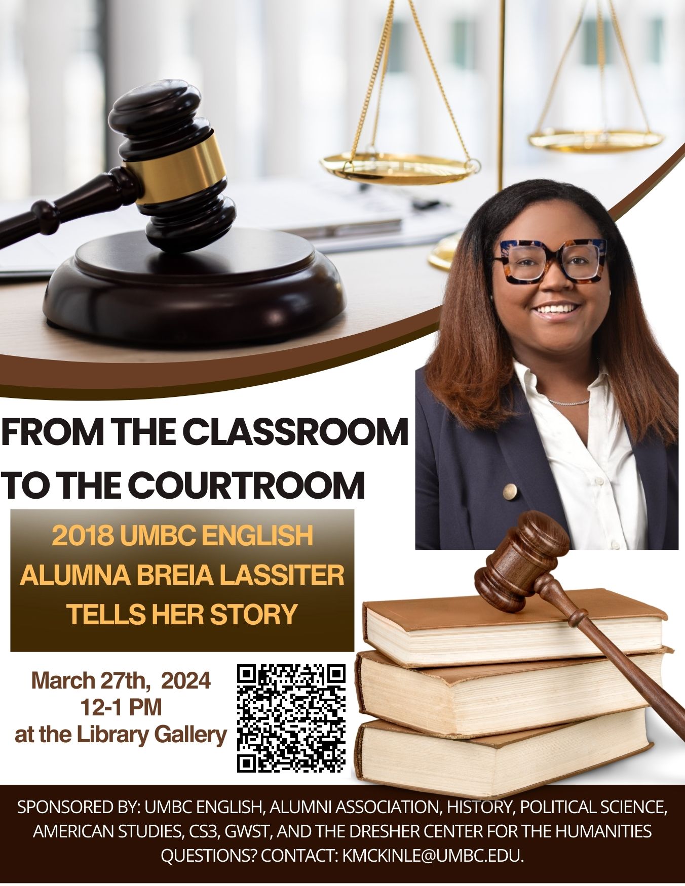 12-1 pm. Library Gallery. “From the Classroom to the Courtroom: 2018 UMBC English Alumna Breia Lassiter Tells Her Story.” Breia Lassiter (Juris Doctor, Michigan State University; Esq.), Associate Attorney in the Employment Law practice group of Dinsmore & Shohl, a law firm in Cincinnati, Ohio, will discuss her personal history from her days as an English major at UMBC, through law school and work as a student clinician at Michigan State University, to taking the bar exam, passing it, and finally now working as an Associate Attorney at a law firm. This talk will be of interest to all Alumni, and to Prelaw, English, and other CAHSS majors, in particular, who are considering career paths in public service.