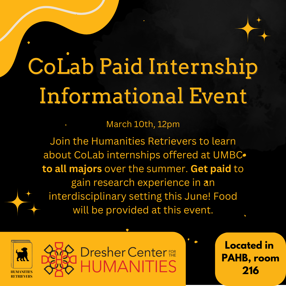 Join the Humanities Retrievers to learn about CoLab Internships offered at UMBC to all majors over the summer. Get paid to gain research experience in an interdisciplinary setting this June! Food will be provided at this event.