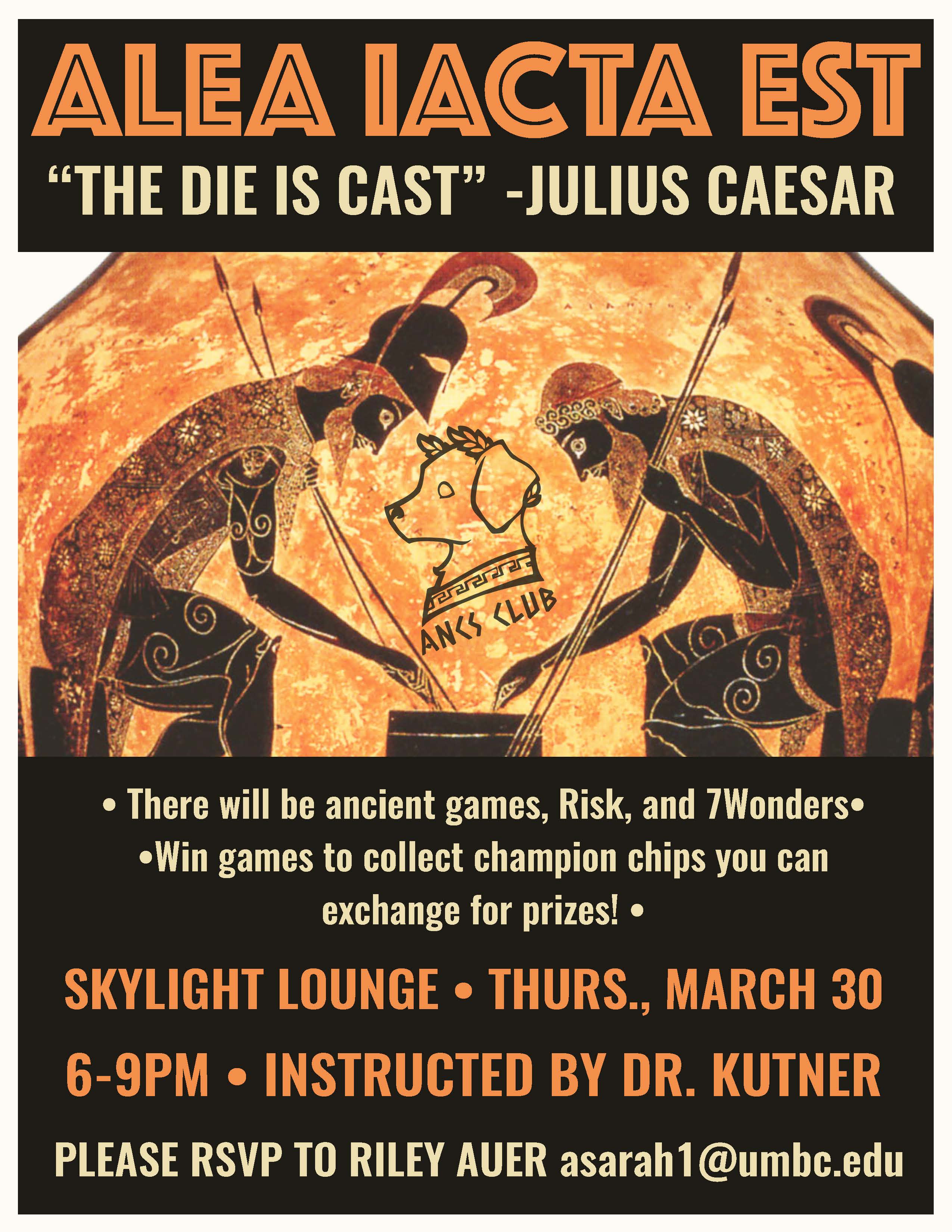 Make sure you check out the Ancient Studies Council Bake Sale table this Wednesday. As you all know, its the Ides of March! We will have Consul pins for sale amongst our sweet treats, and FREE Alea Iacta Est stickers. Also, come check us out for a FREE chance to "stab" Caesar to enter our Starbucks Gift Card give away.