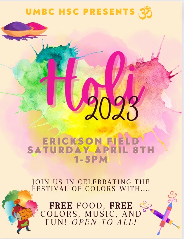 Join the UMBC HSC on Erickson Field this Saturday, April 8, from 1-5pm for a Holi festival! Enjoy games, food, and entertainment in this lively celebration of the festival of colors - see the attached flier for additional information.