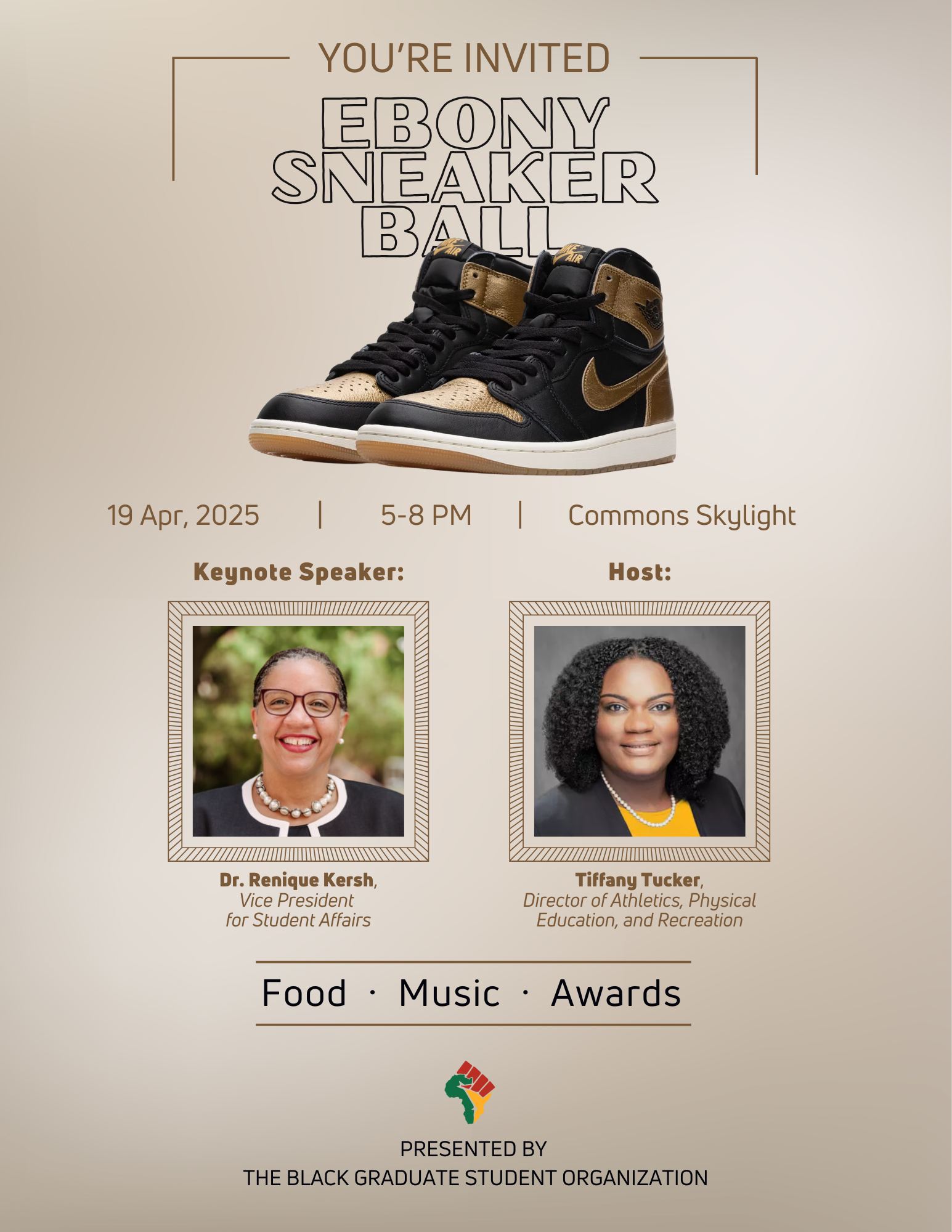You are invited to the Black Graduate Student Organization (BGSO) Ebony Sneaker Ball and Black Excellence Award Ceremony, taking place on Saturday, April 19, 2025, in the Commons Skylight Room at UMBC. This event is a cherished tradition that honors the achievements and contributions of UMBC Black graduate students, faculty, staff, and community members.
