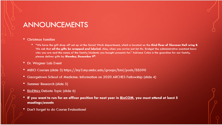 Thank you to those who attended the meeting today. I just wanted to share the announcements I went through in the meeting, which pertain to not only the club, but also to some upcoming internships. Please see the attached image (below) for the preview and the full PowerPoint (posted in the Files tab) for more details.