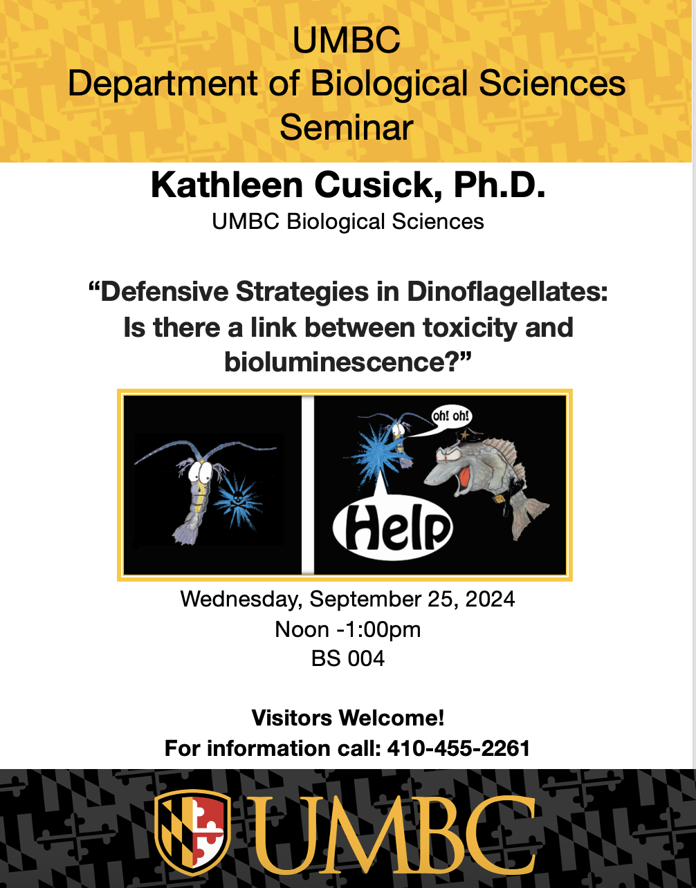 Please join the Department of Biological Sciences, in BS 004 for a seminar given by Dr. Kathleen Cusick of the UMBC Biological Sciences Department.