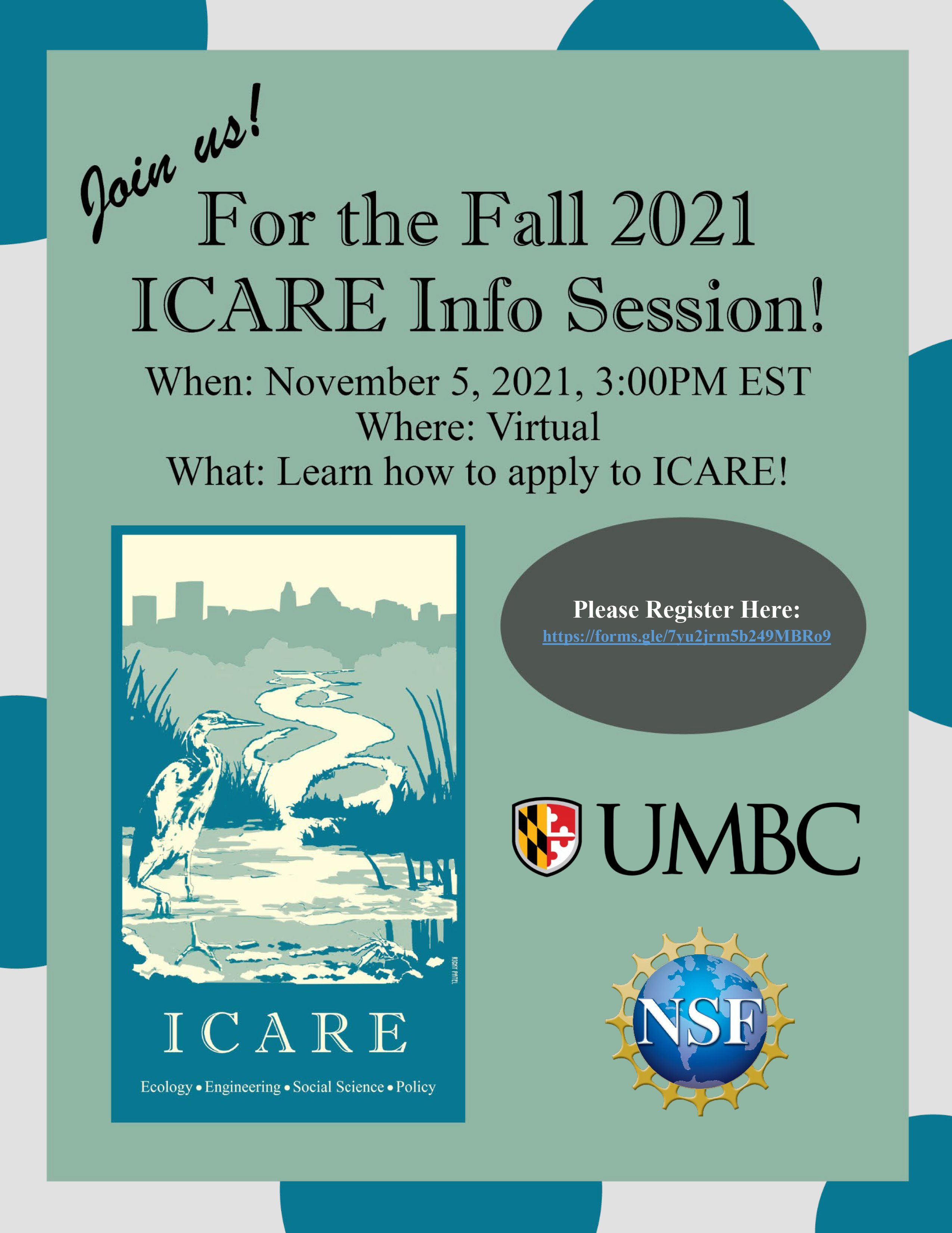 The ICARE NRT master’s degree is a 2-year interdisciplinary degree program with a dual mission of diversity, equity, inclusion, and justice combined with research focused on improving the health of Baltimore Harbor as a socioecosystem. Students will be mentored by a UMBC faculty member and a non-academic scientist from a government agency, non-profit, or industry.