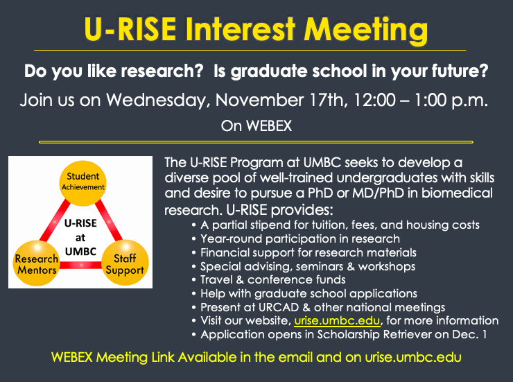 Are you interested in pursuing a PhD in the biomedical sciences? If so, please join the U-RISE Program Interest Meeting on Wednesday, November 17th, at 12:00 p.m. on this Webex link.
