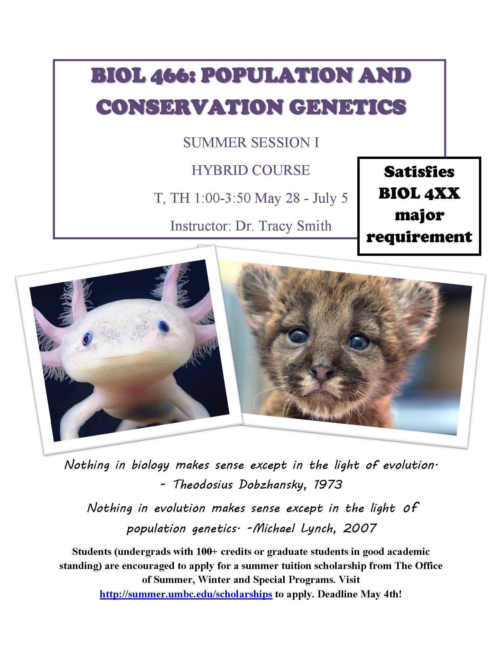 During Summer Session I, Dr. Tracy Smith will be teaching BIOL 466: Population & Conservation Genetics. This course fulfills a BIOL 400-level course for all BIOL and BINF majors.