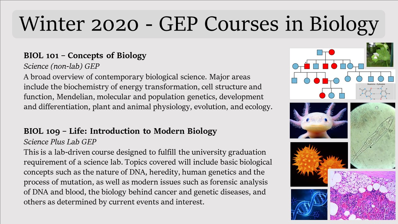 This is a lab-driven course designed to fulfill the university graduation requirement of a science lab. Topics covered will include basic biological concepts such as the nature of DNA, heredity, human genetics and the process of mutation, as well as modern issues such as forensic analysis of DNA and blood, the biology behind cancer and genetic diseases, and others as determined by current events and interest.