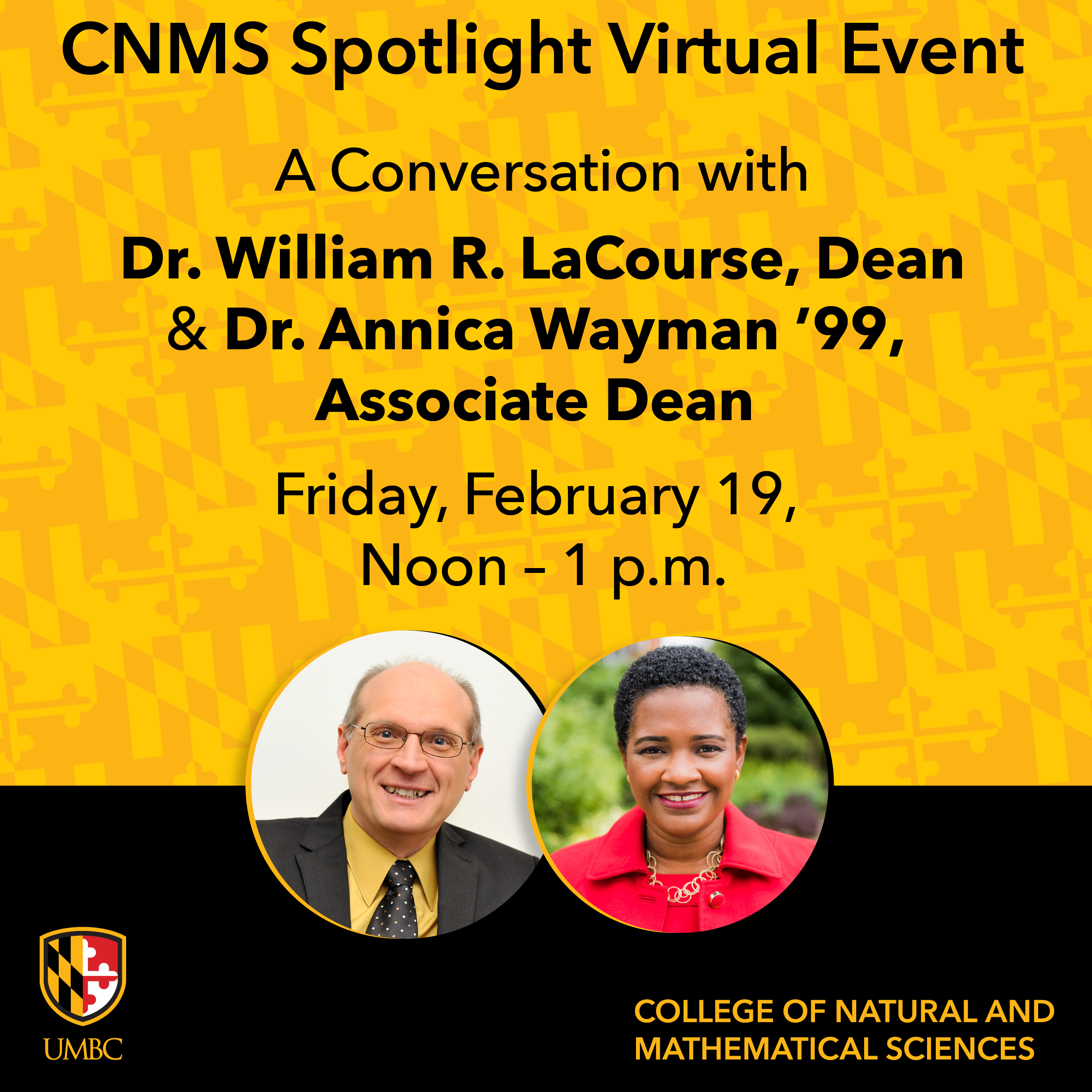 Join fellow Retrievers Friday, February 19 for an inside look at the College of Natural and Mathematical Sciences in the current landscape. Annica Wayman ’99, M6, associate dean for Shady Grove Affairs in CNMS, will engage with Bill LaCourse, dean of CNMS, about
