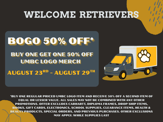 Welcome Retrievers! Stop by the UMBC Bookstore August 23rd - 29th to kick off our BOGO 50% off sale on UMBC logo merch.* *Buy one regular priced UMBC LOGO Item and receive 50% off a second item...