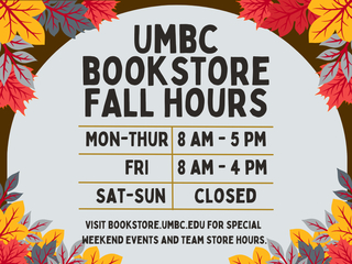 The Bookstore's Fall Hours have begun! Monday–Thursday: 8 AM to 5 PM Friday: 8 AM to 4 PM The Bookstore will be closed on most weekends, but you can visit: bookstore.umbc.edu for information...
