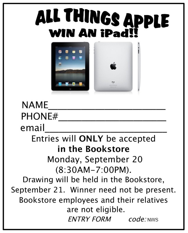 Print out the attached form and bring it with you to the Bookstore on Monday, September 20 for a chance to win a free Apple iPad. Learn about special educational pricing and other deals from an Apple corporate representative.