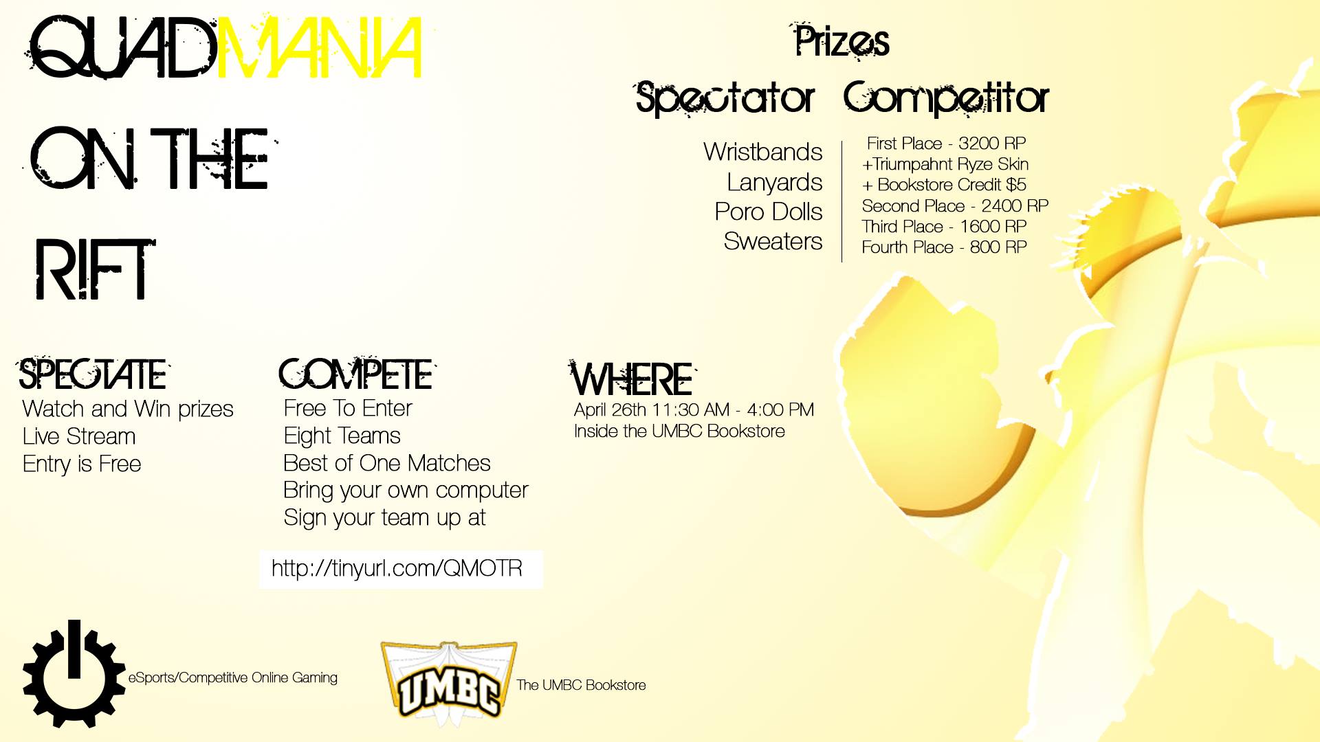 UMBC e-Sports Competitive Online Gaming Club presents Quadmania on the Rift April 26 at UMBC Bookstore. Compete or spectate for free and win prizes!