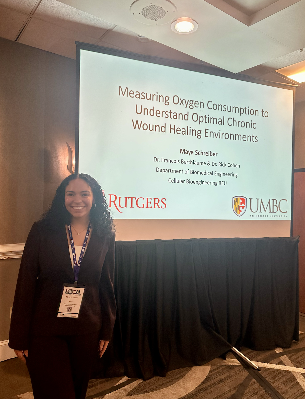 Maya gave a 10 minute oral presentation titled “Measuring Oxygen Consumption to Understand Optimal Chronic Wound Healing Environments” and engaged in a Q&A session about her work with the judges and attendees. Her research poster was also displayed for the duration of the conference. The judges evaluated the presenters and awarded Maya with first place in the Undergraduate category. Congratulations to Maya on all of her success!