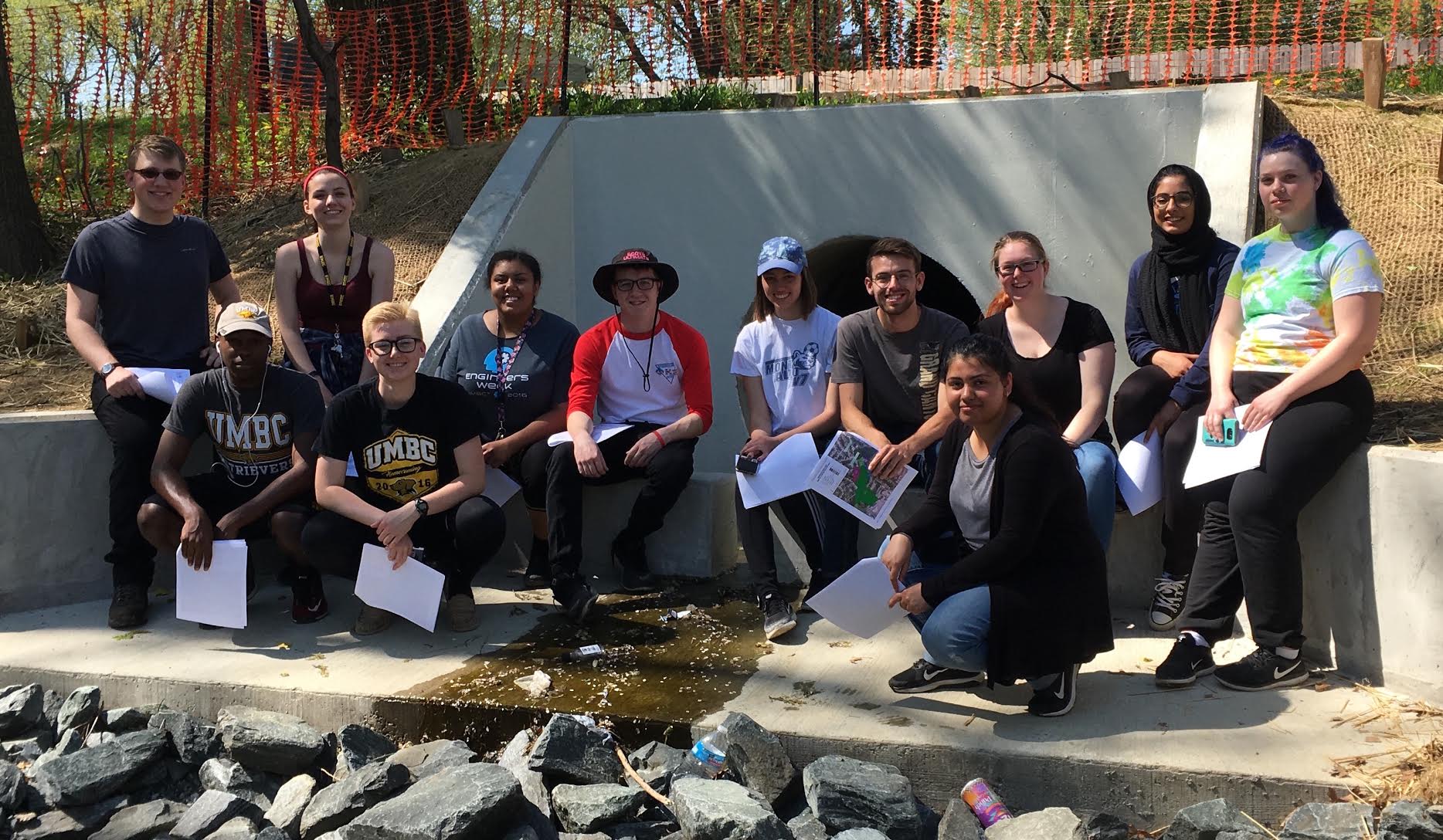 ENCH 210 (Introduction to Environmental Engineering) class on a field trip led by Dr. Welty to explore a recently-completed stream restoration and water quality pond in Dead Run watershed in Catonsville, MD. The purpose of the Baltimore County installations is to reduce sediment, nitrogen, and phosphorous loads to the Chesapeake Bay. Students from left to right: Ethan Crookshank, Rudolph Holley, Bridget Anger, Taylor Stephen, Jada Demond, Colin Altman, Laina Colony, Dakota Blum, Reda Munir, Emma Connelly, Samina Musa, and Gabrielle Pozza.
