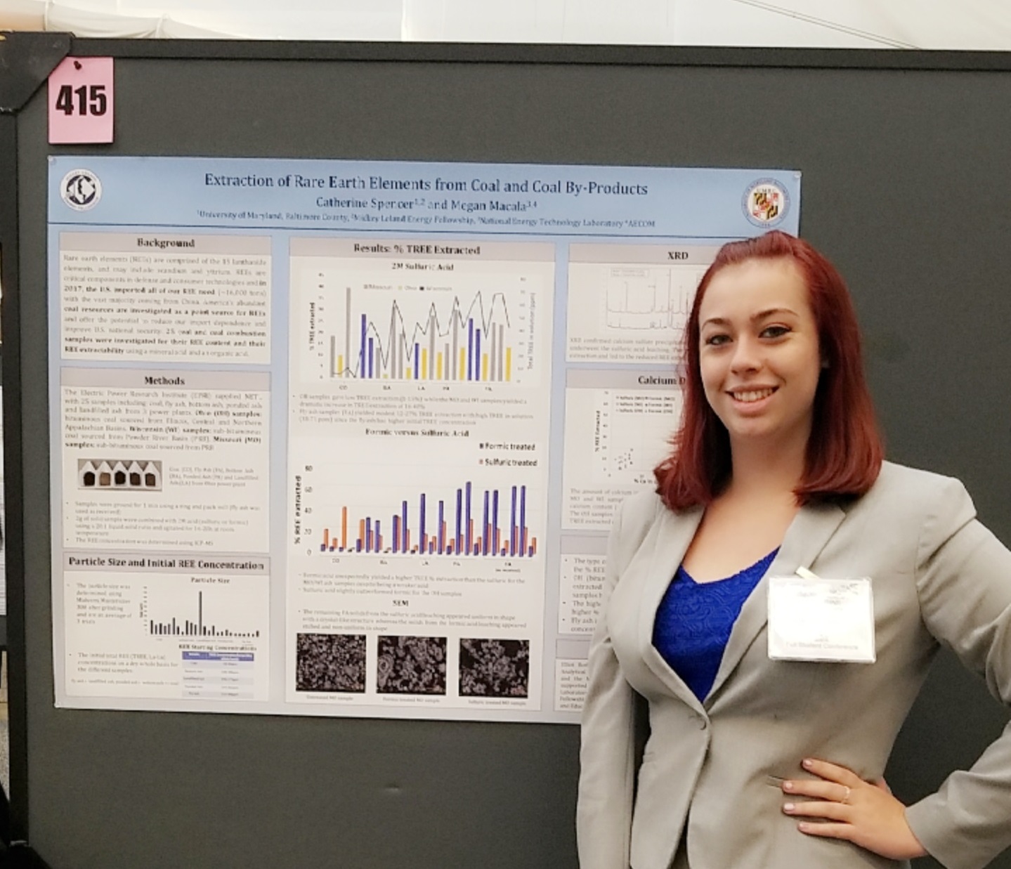 The CBEE Department at UMBC proudly congratulates CBEE student Catherine Spencer for her success in winning first place in her category, "Separations," at the collegiate poster competition of the American Institute of Chemical Engineers' Annual Meeting and Student Conference in Pittsburg. Her poster is titled "Extraction of Rare Elements from Coal and Coal by-products," and focuses on her summer research at the National Energy Technology Laboratory. Catherine is a senior ChE major.