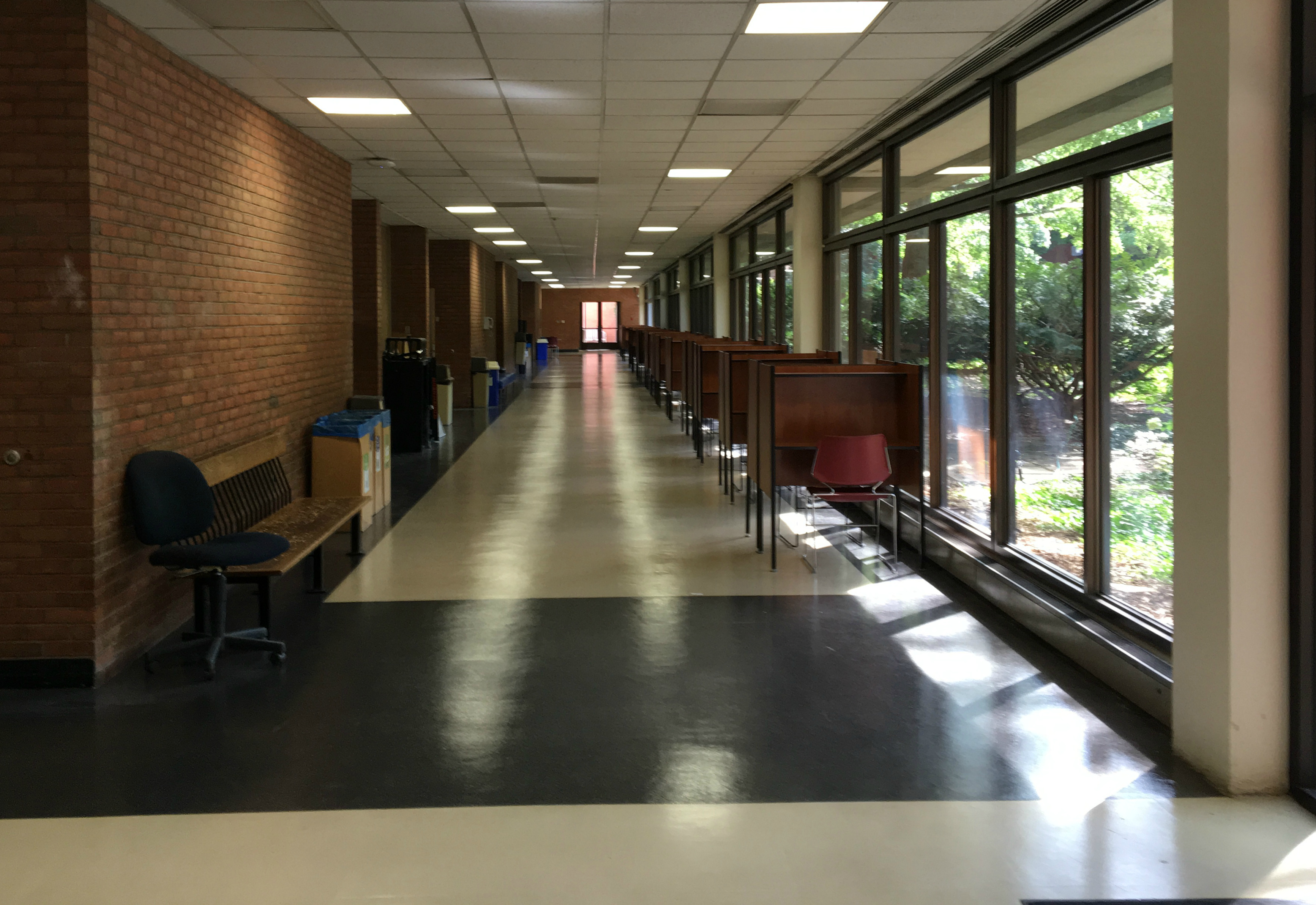 We're going to be posting a series of Then and Now photos on Co-Create UMBC this year in celebration of UMBC's 50th anniversary. Here are two photos taken from the same spot on the first floor of the Math-Psychology Building: one around 1968 (when it was under construction and called the Faculty Building) and one in 2016.