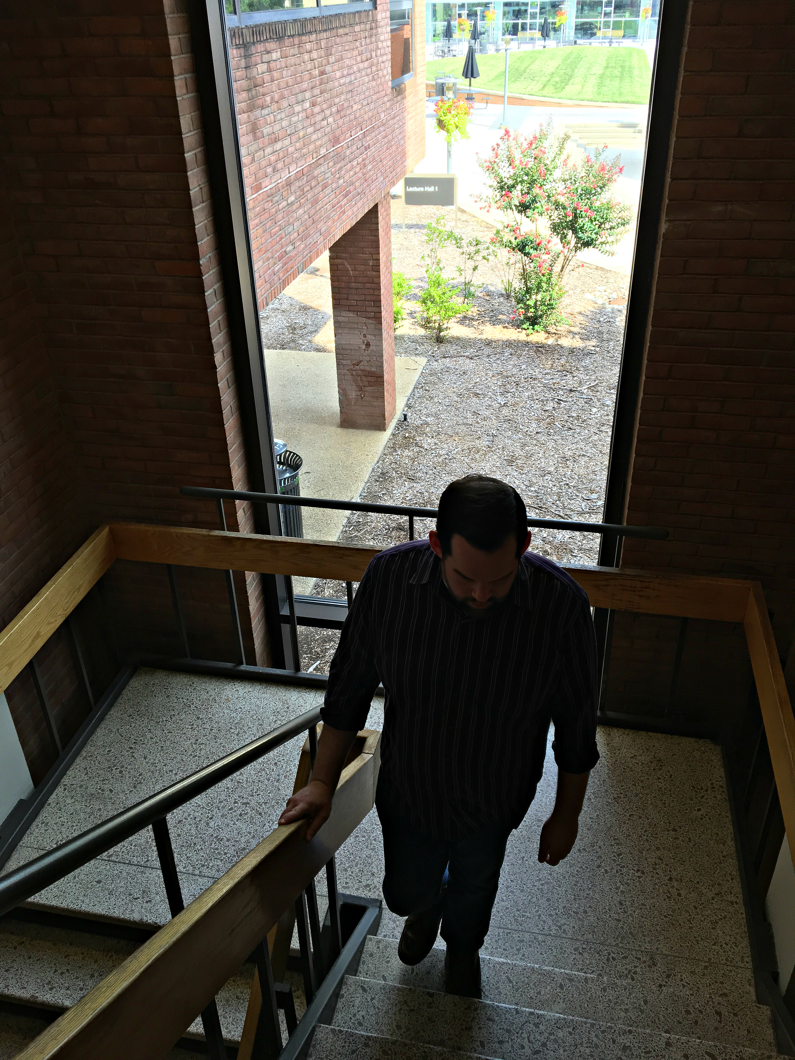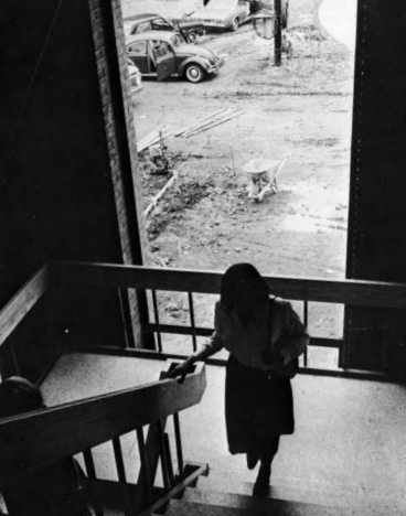 The first photo below was taken on a stairwell in what was then called the Academic Building, on that very first day; the second, fifty years later (in what is now called the Biological Sciences Building). The difference in the views out that window tells a small part of a great story still being written.