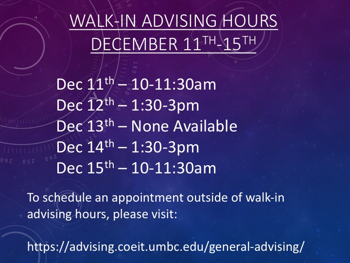 Our advising offices are located in ITE 202-206. Email and telephone contact information is available here.
