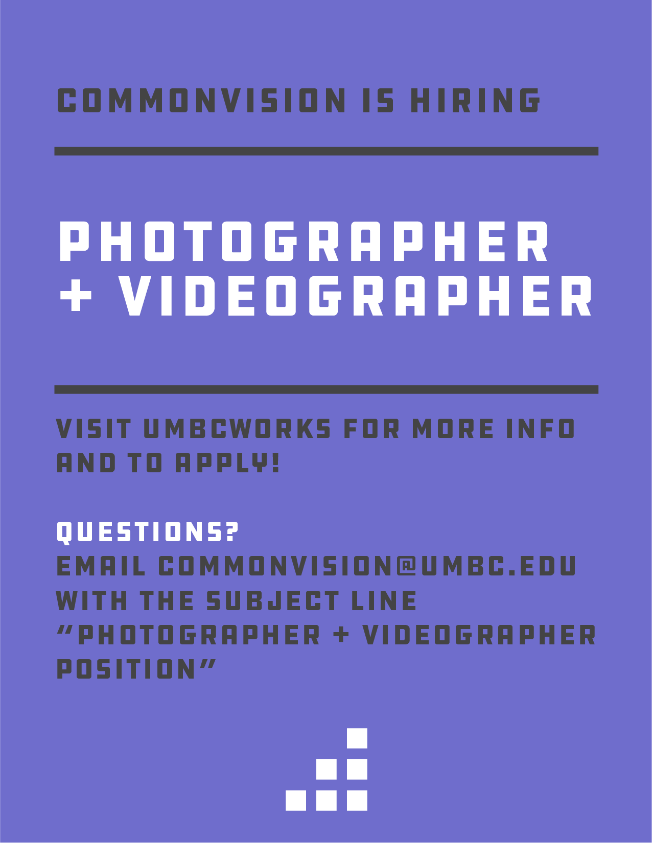 via UMBCworks. Anything you are not able to submit there please e-mail commonvision@umbc.edu with the subject line “commonvision Videographer Application Summer 2022”.