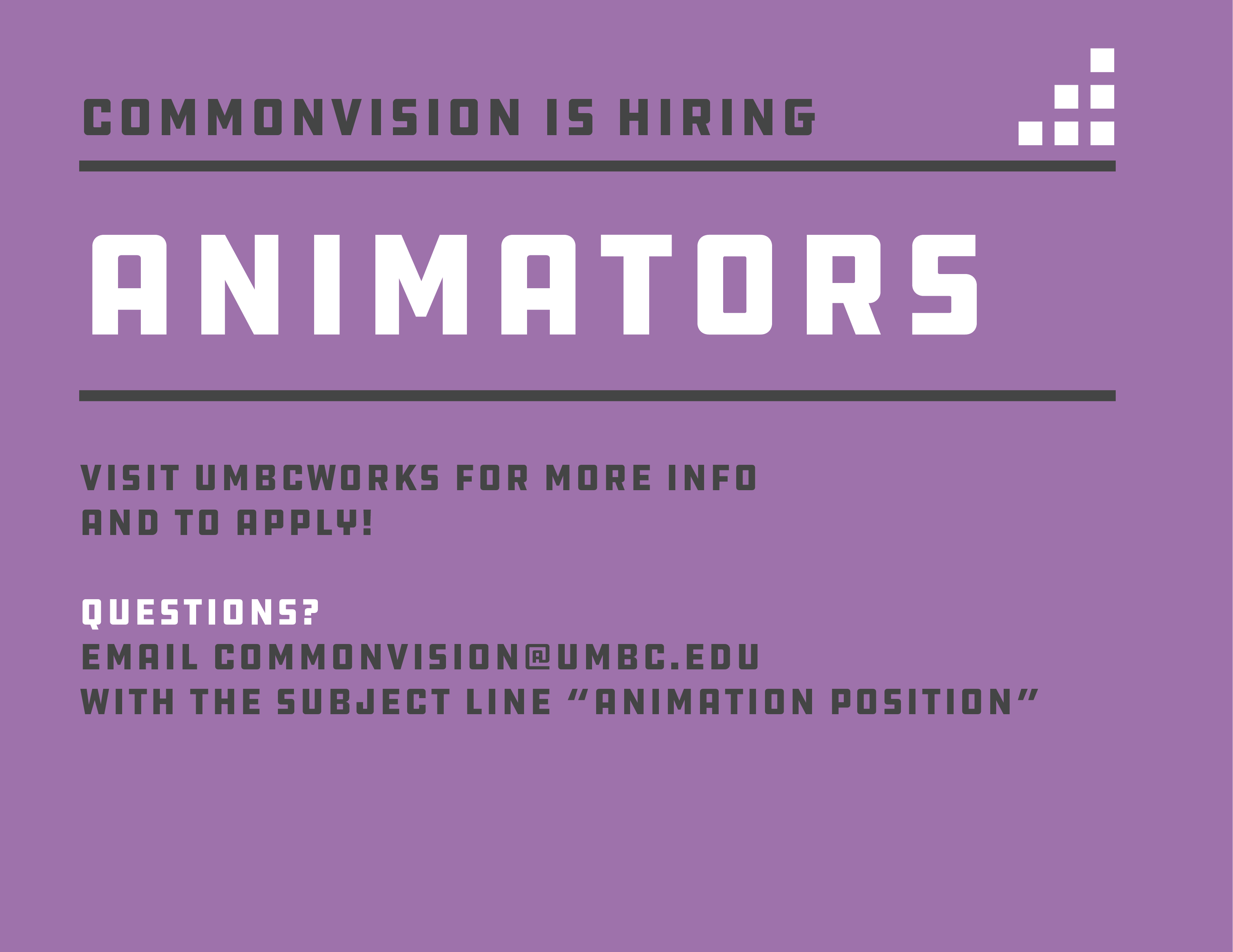 via UMBCworks. Anything you are not able to submit there please e-mail commonvision@umbc.edu with the subject line “commonvision Animator Application Winter 2019”.