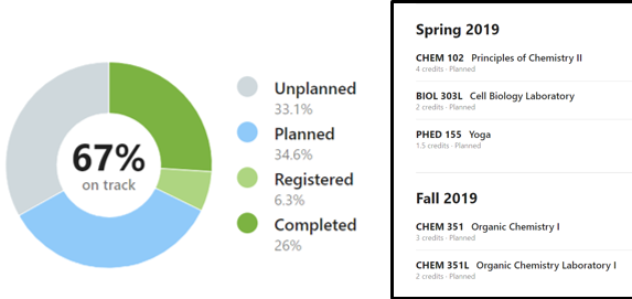 The Degree Planner helps you plan courses toward graduation by allowing you to designate courses you plan to take in future terms. Once you’ve added courses to your planner, the proposed courses will show up as “planned” in your Degree Donut. The goal is to get your donut to 100% to ensure that you have the best estimate of when you plan to complete your degree.
