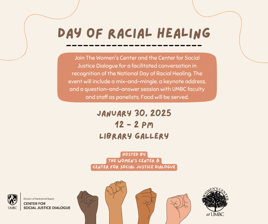 Join The Women's Center and the Center for Social Justice Dialogue for a facilitated conversation in recognition of the National Day of Racial Healing. The event will include a mix-and-mingle, a keynote address, and a question-and-answer session with UMBC faculty and staff as panelists. Food will be served.