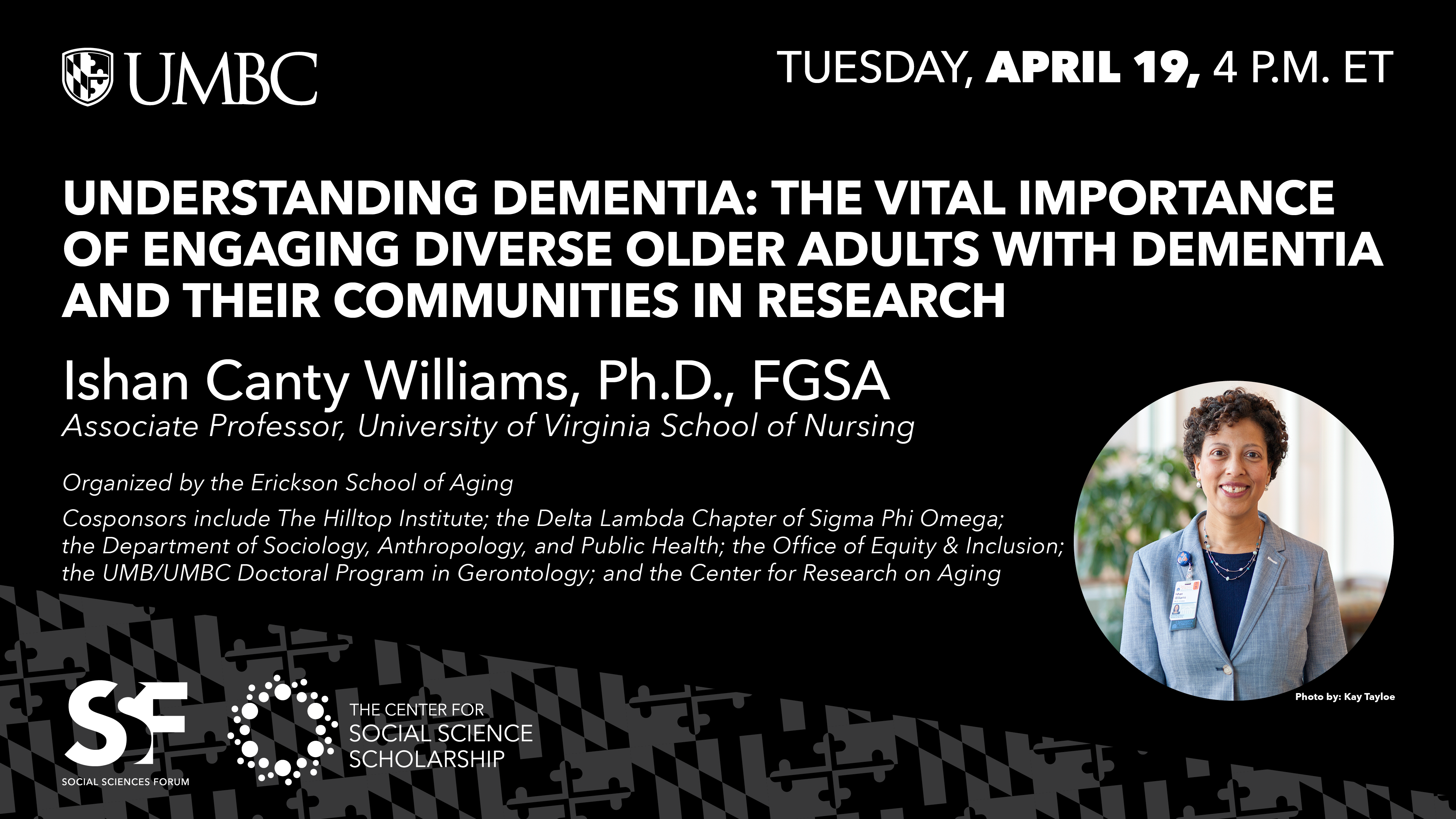 Cosponsors include The Hilltop Institute; the Delta Lambda Chapter of Sigma Phi Omega; the Department of Sociology, Anthropology, and Public Health; the Office of Equity & Inclusion; the UMB/UMBC Doctoral Program in Gerontology; and the Center for Research on Aging.