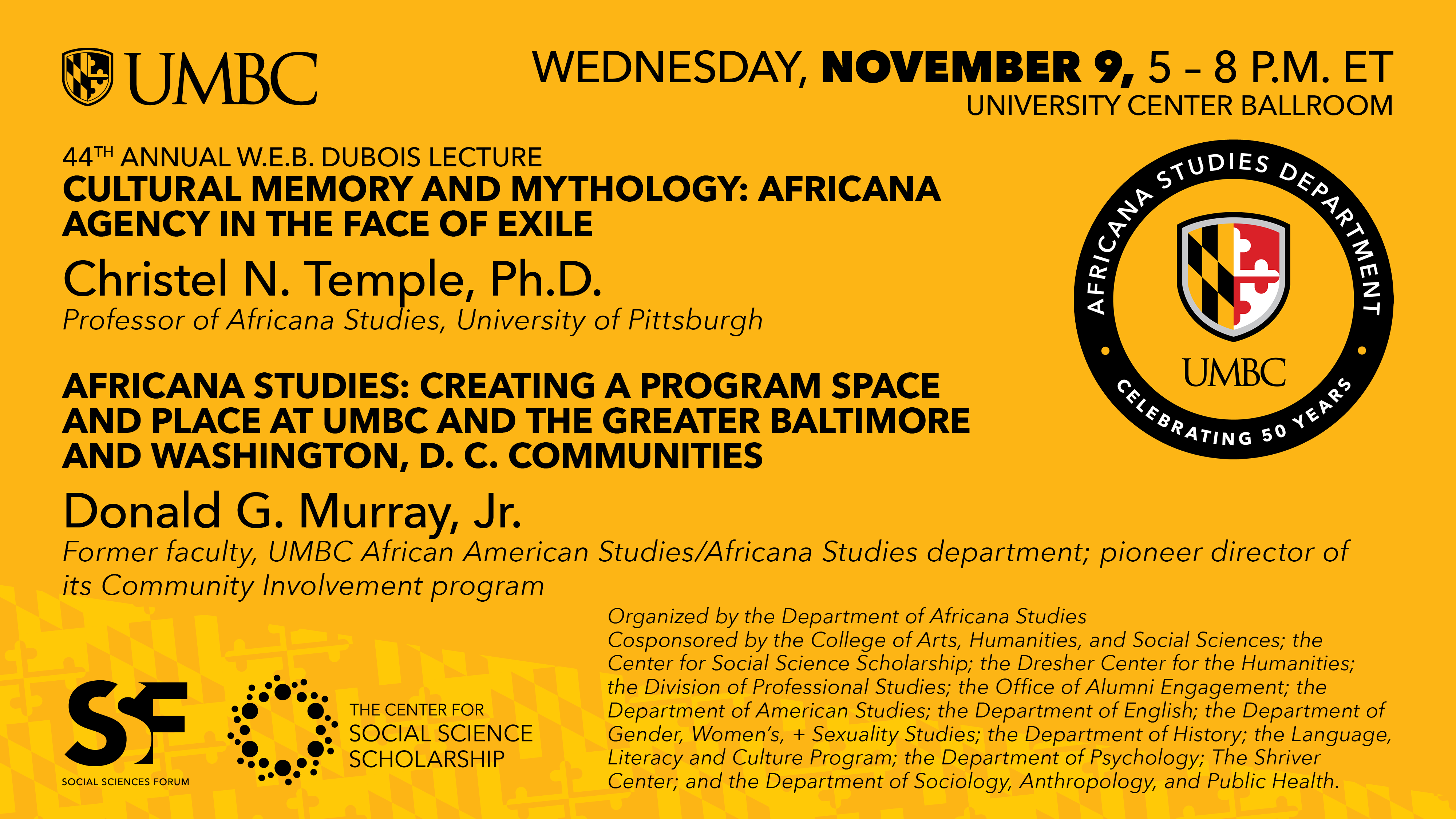 Organized by the Department of Africana Studies. Cosponsored by the College of Arts, Humanities, and Social Sciences; the Center for Social Science Scholarship; the Dresher Center for the Humanities; the Office of Alumni Engagement; the Division of Professional Studies; the Department of American Studies; the Department of English; the Department of Gender, Women’s, + Sexuality Studies; the Department of History; the Language, Literacy and Culture Program; the Department of Psychology; The Shriver Center; and the Department of Sociology, Anthropology, and Public Health.