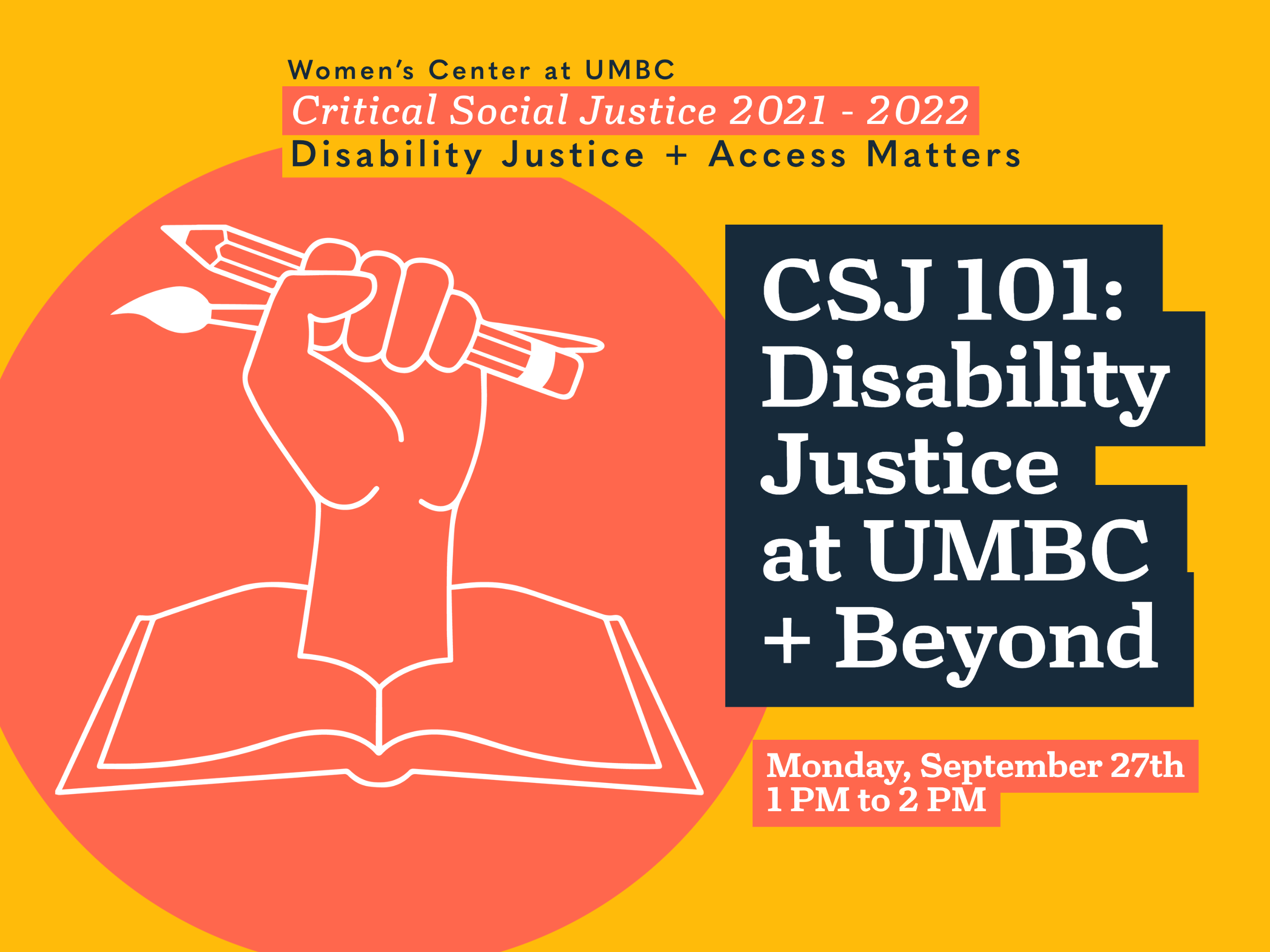 This year, CSJ: Disability Justice + Access Matters invites our campus community to learn from a perspective of disability justice so that we can continue to make space for everybody and every body now and in the future. Learn more about the Critical Social Justice: Disability Justice + Access Matters theme here. For more information about upcoming events or to inquire about collaboration, please email the Women’s Center at womenscenter@umbc.edu.