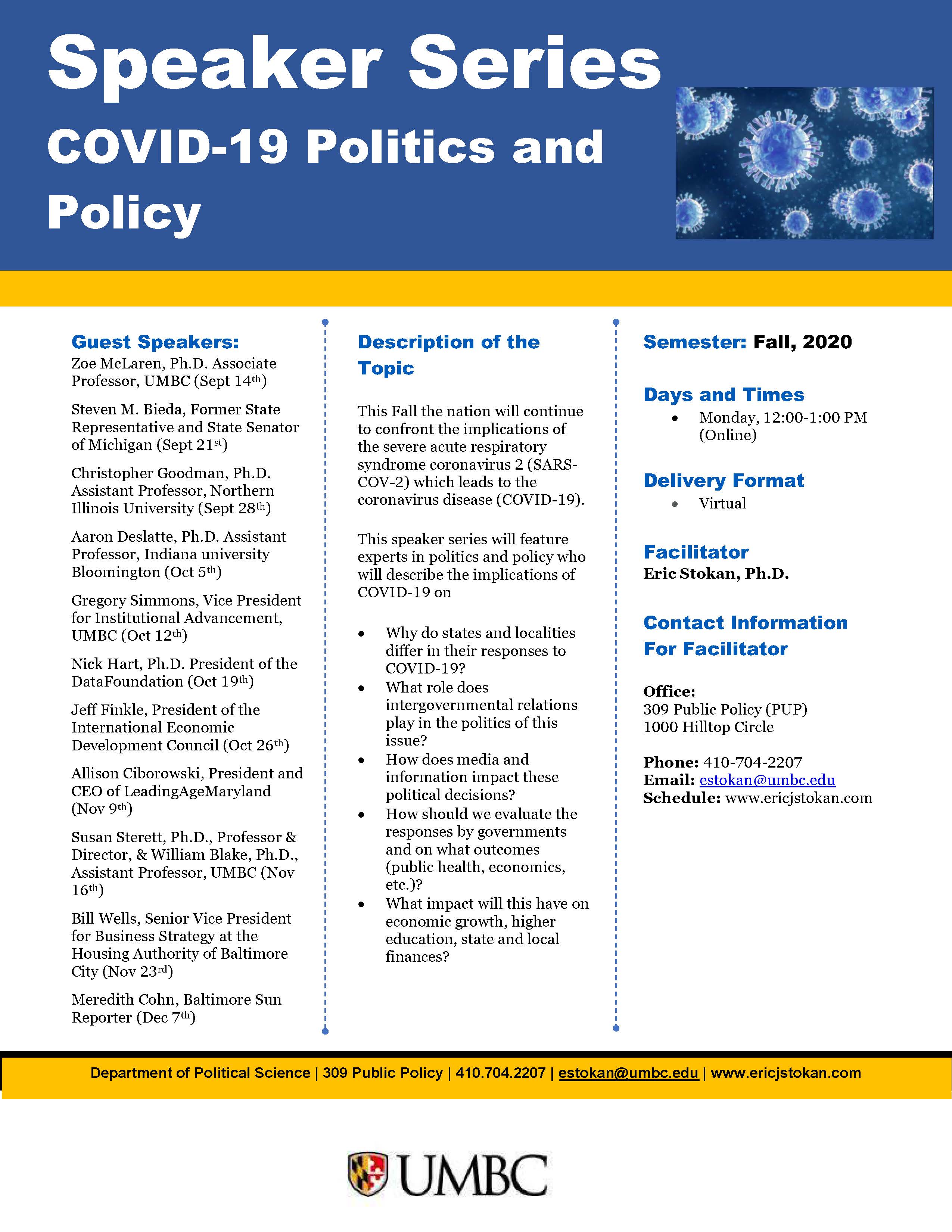 This speaker series will be facilitated by Eric Stokan, Ph.D. (UMBC, Political Science) and will take place virtually on Mondays from 12-1 p.m. Webex links for each session will be posted here as the dates approach.
