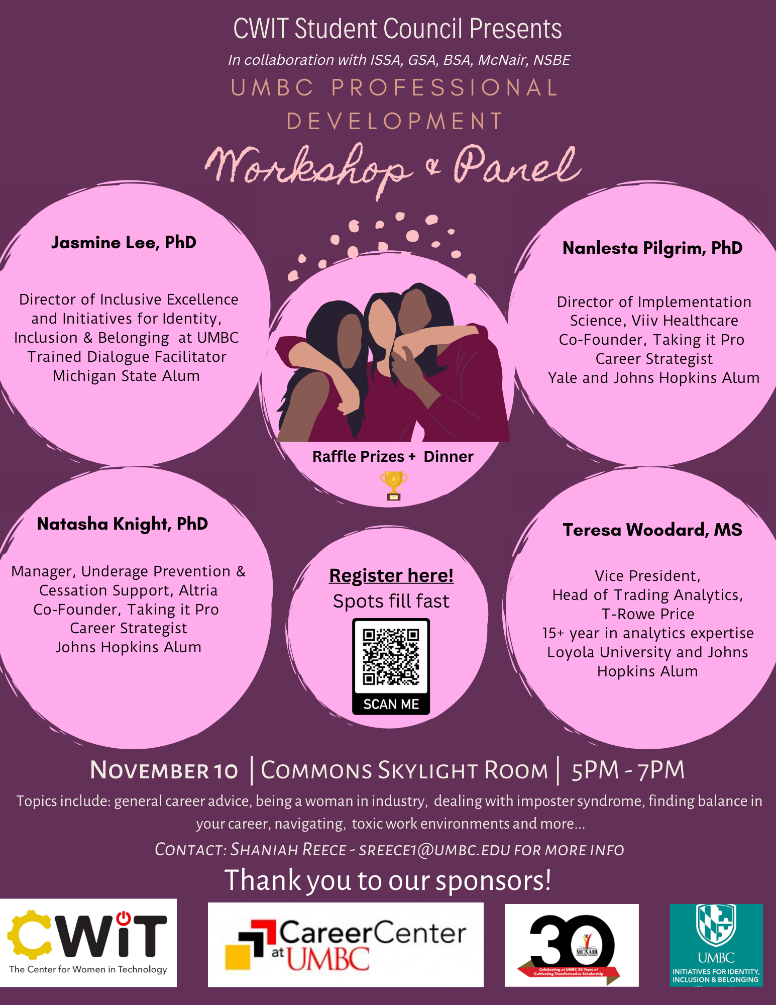 The CWIT Student Council in collaboration with ISSA, GSA, BSA, McNair, and NSBE will be hosting a Professional Development Workshop & Panel Discussion on November 10th in the Commons Skylight Room.