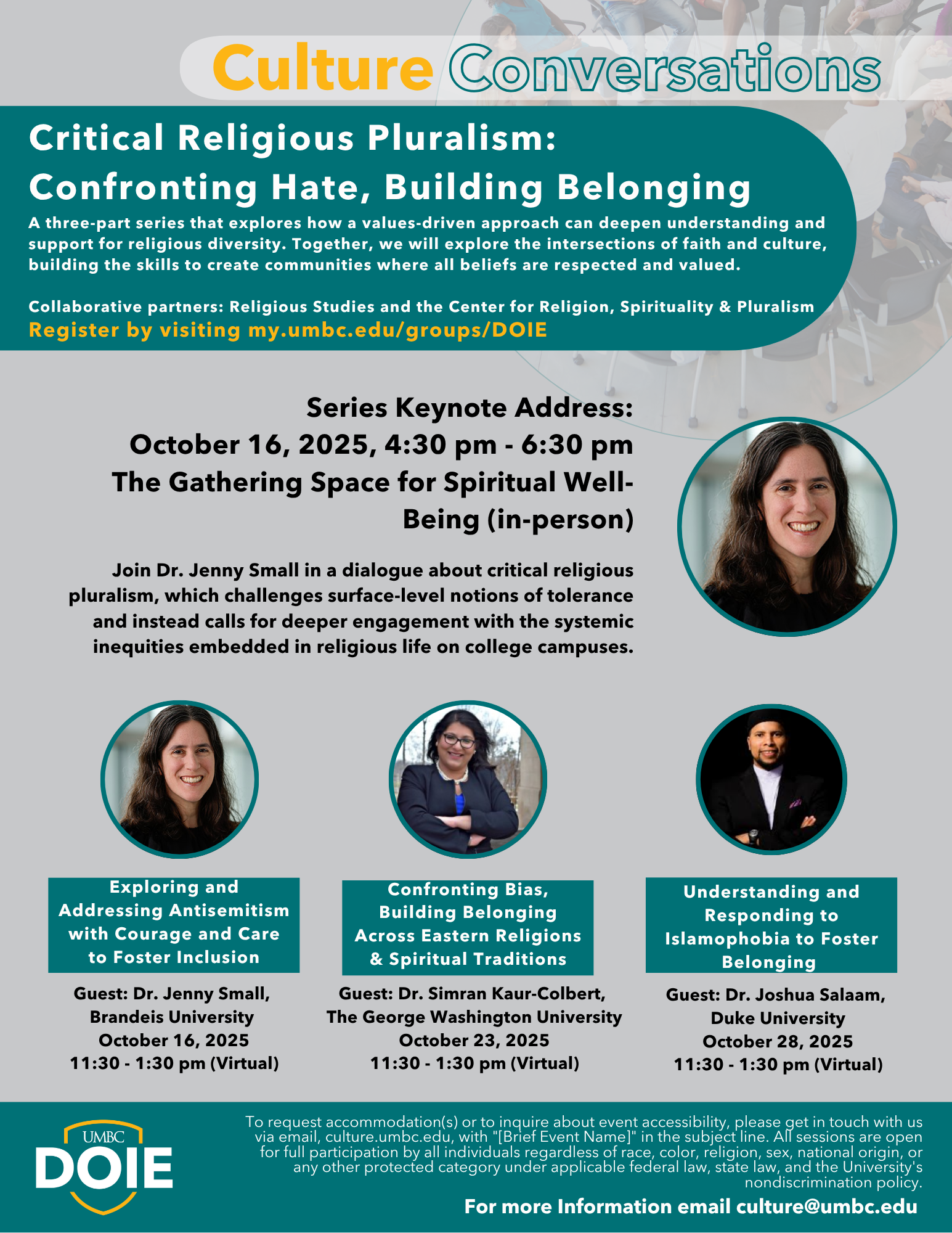 - Critical Religious Pluralism (series keynote): Join Dr. Jenny Small in a dialogue about critical religious pluralism, which challenges surface-level notions of tolerance and instead calls for a deeper engagement with the systemic inequities embedded in religious life on college campuses. Event details: https://my3.my.umbc.edu/groups/doie/events