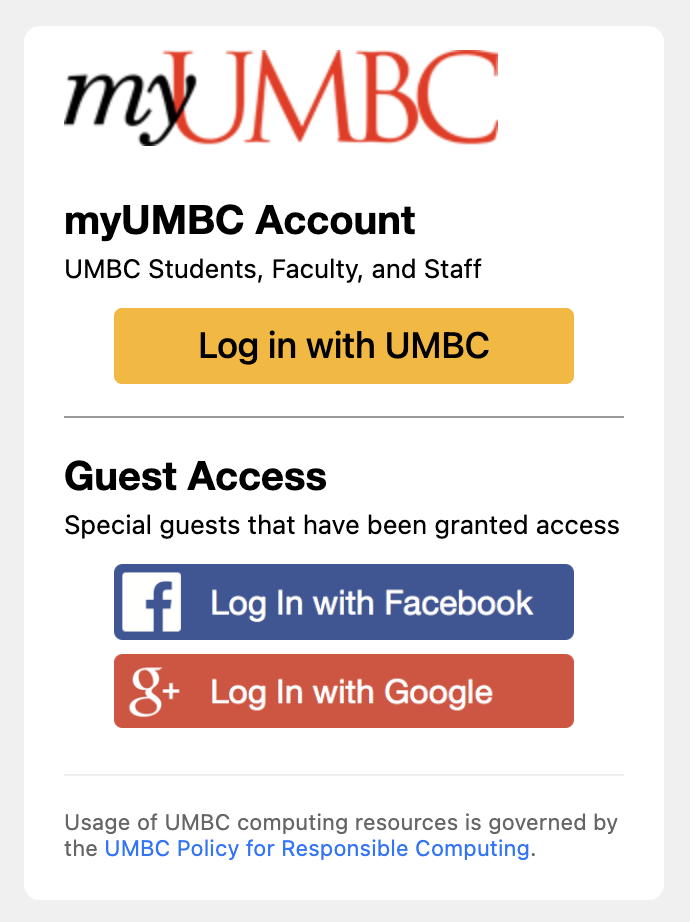 For most people, you will select UMBC and then be prompted to enter your login information. Family and visitors with special access will continue to use the Facebook and Google login options.