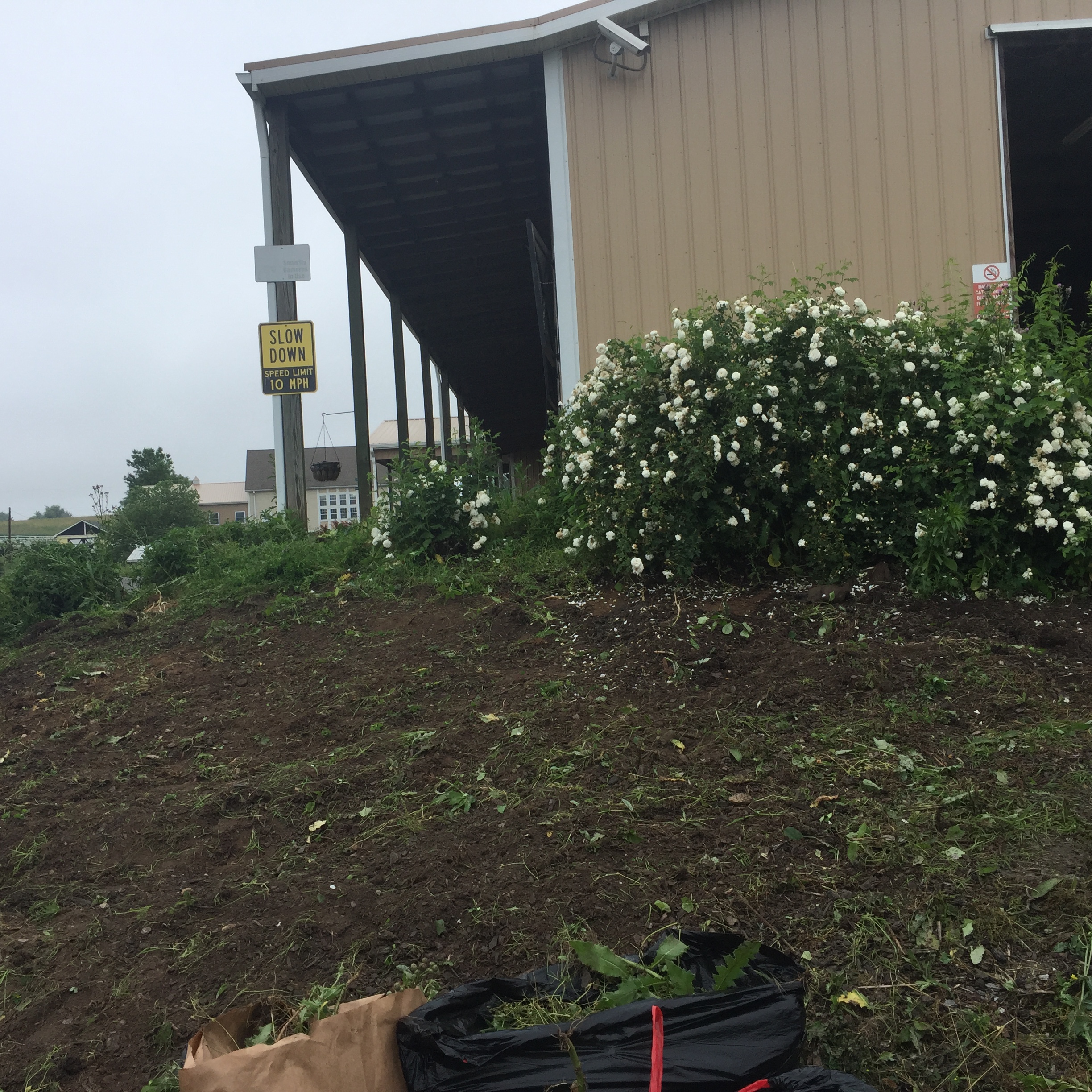 The area that had been overrun by weeds. They were prickly and very hard to get out, requiring the team to use gloves.