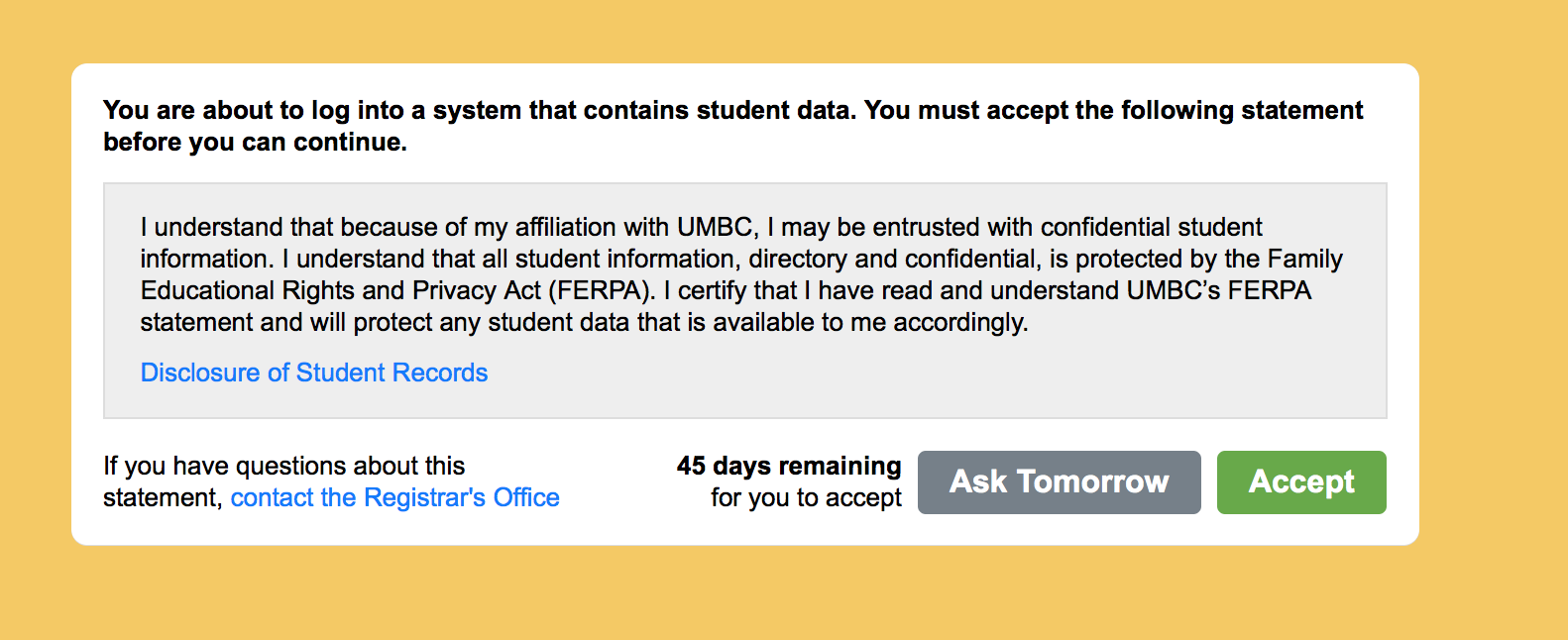 If you see the FERPA acknowledgement screen below, you have 45 days to accept or your access to these systems will be disabled. For more information, an FAQ is available at https://wiki.umbc.edu/x/JgAEB