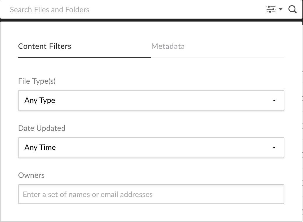 Screenshot shows the new Box experience search bar. Easily switch between your content filters or Metadata.