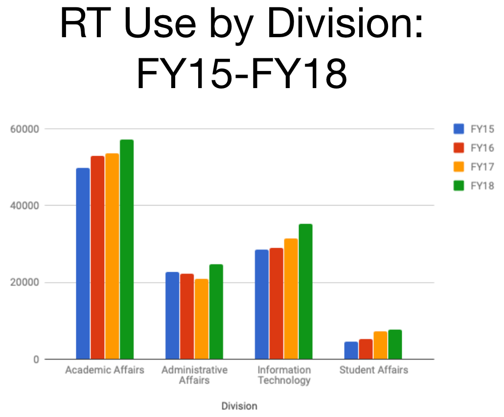 “Leaders such as Yvette Mozie-Ross, Ben Lowenthal, Connie Pierson, and Valerie Thomas all worked with Joe to move their support services over to RT, too. From there, John, Kevin Joseph, and Andrea Mocko developed the service management approach of using the campus’ Report Exchange (REX) data warehouse and created FAQ's to provide consistency and support self-service."