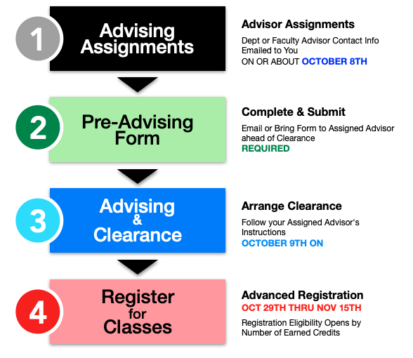 Advanced Registration for Spring 2025 classes begins October 29th, 2024 according to your earned credits. Once you are cleared, then check the Registration Appointment Calendar for the date/time of your registration slot.