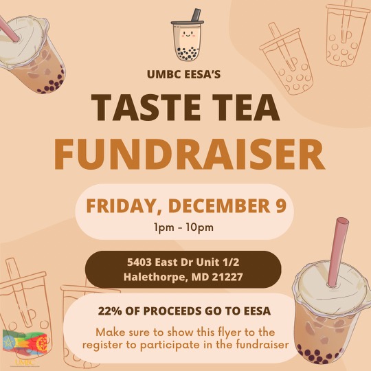 Do not forget tomorrow is our very first fundraiser so come out to Taste Tea to support UMBC EESA! Make sure you order at the register and tell the barista you are a part of UMBC EESA or show the attached flyer. Taste Tea is located just right down the street so you can take the UMBC shuttle bus going to Arbutus. We hope to see you all there!