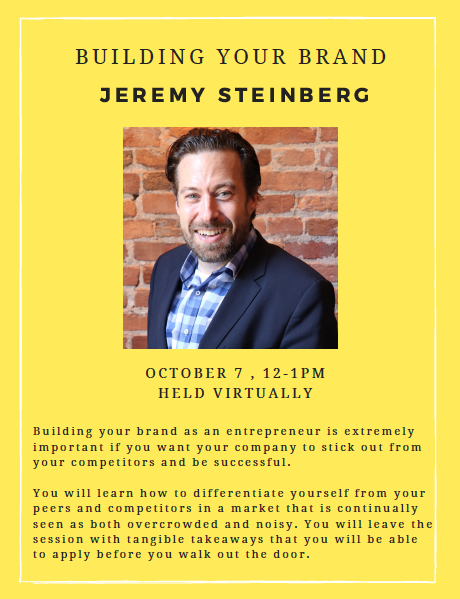 Building your brand as an entrepreneur is extremely important if you want your company to stick out from your competitors and be successful. Come join us for an interesting workshop with entrepreneur Jeremy Steinberg on October 7th from 12 - 1 -- Held Virtually. Jeremy, who is a managing partner of Antson Advisors, will work with you on building your own personal brand in this interactive one hour session.