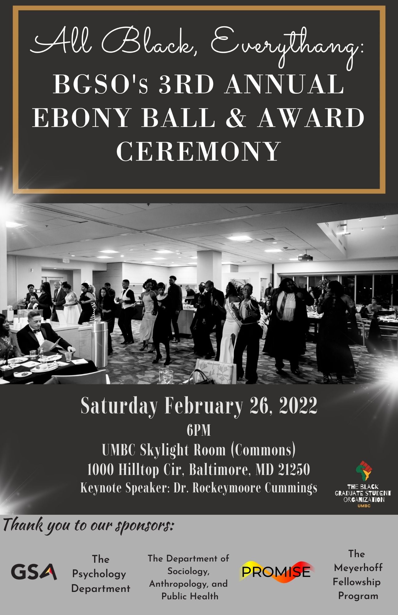 The Black Graduate Student Organization (BGSO) at UMBC is hosting its 3rd annual Ebony Ball and Award Ceremony. It will be on Saturday, February 26th, 2022, at 6 PM. Our keynote speaker for this year is American politician, founder, and educator, and wife of the late Congressman Elijah Cummings, Dr. Maya Rockeymoore Cummings.