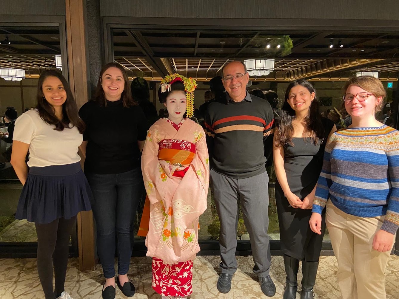 Photo, left to right: UMBC ATPH graduate students Nirandi Jayasinghe and Rachel Smith, ESI director Dr. J. Vanderlei Martins, and UMBC ATPH graduate students Greema Regmi and Hannah Seppala stand next to a woman in traditional kimono attire at the APOLO conference in Kyoto, Japan. (Photo credit: R. Smith/ESI)