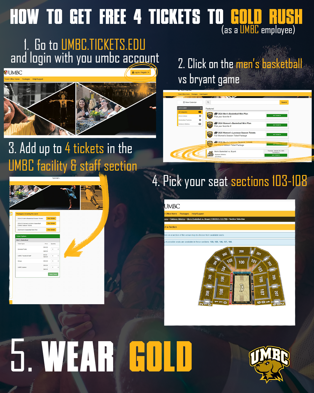 We are excited to invite you to CEI Arena on Thursday, January 30th for the Gold Rush game, as the Men’s Basketball team takes on Bryant University at 7:00 P.M. As part of our ongoing appreciation for your support, UMBC faculty and staff are eligible to claim up to 4 free tickets to this highly anticipated rivalry game!