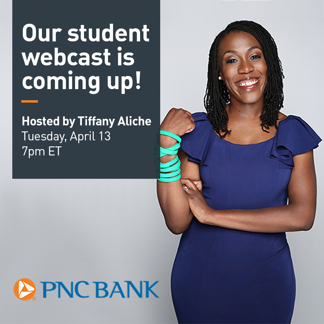 PNC Bank will be hosting their annual student financial education webcast during Financial Literacy month on April 13th! This year’s event will be completely virtual and hosted by award-winning teacher of financial education, Tiffany Aliche, aka “The Budgetnista.”